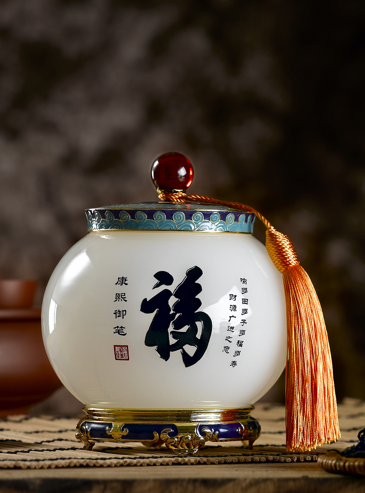 金玉制品歷來珍貴和吉祥,金玉與法蘭彩的結合更顯珍貴,作品福運平安,取自傳統的將軍瓶罐造型,形態威風凜凜,短頸豐肩,鼓腹下斂,器型飽滿,罐身加刻康熙御筆天下第一福字,寓意福運齊天,幸福安康。