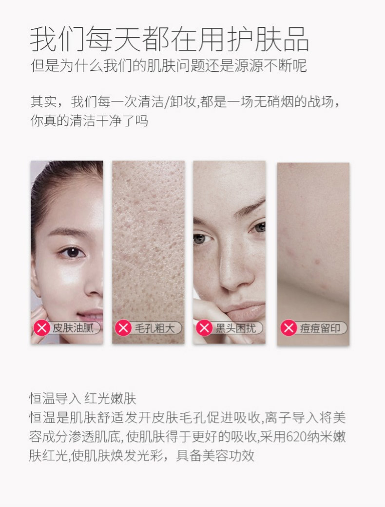 2、多功能同步離子導出模式,清潔毛孔,通透肌膚,trophoSkin-i特有多維離子導出模式,聲波按摩與熱敷張開毛孔,離子導出吸附毛孔臟污、深層清潔,讓肌膚更晶瑩剔透、緩解痘痘肌、毛孔粗大等問題