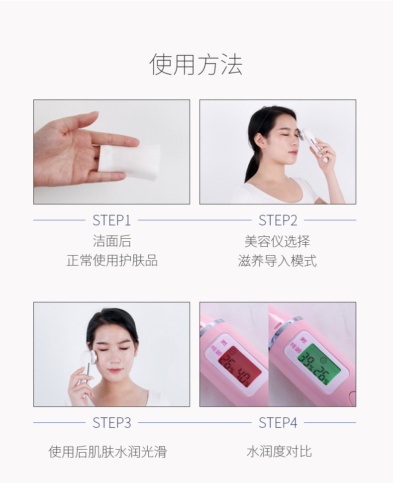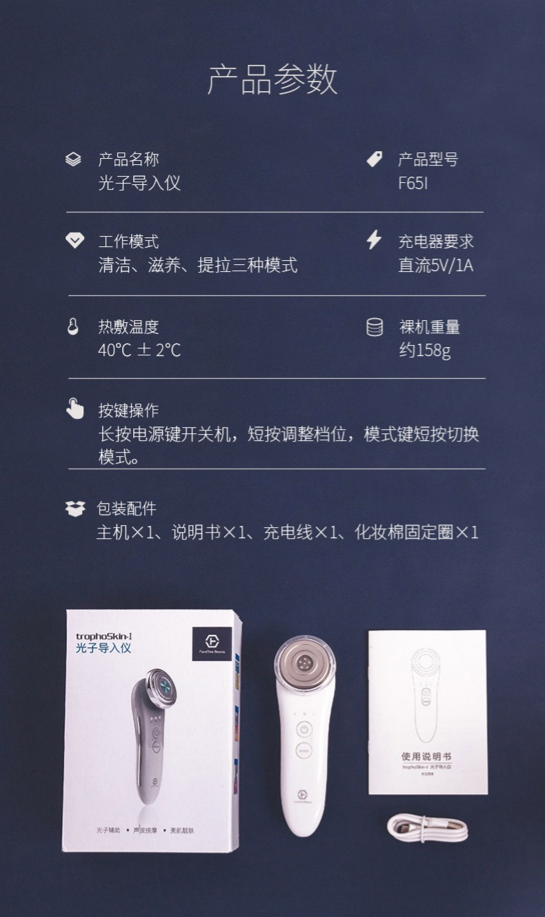 3、多功能同步的光子導入模式,輔助護膚品的吸收,trophoSkin-i的離子功能配合聲波按摩同步導入,熱敷舒緩張開毛孔讓護膚分子更易吸收,光子輔助同步作用,帶來全新的美容護膚體驗