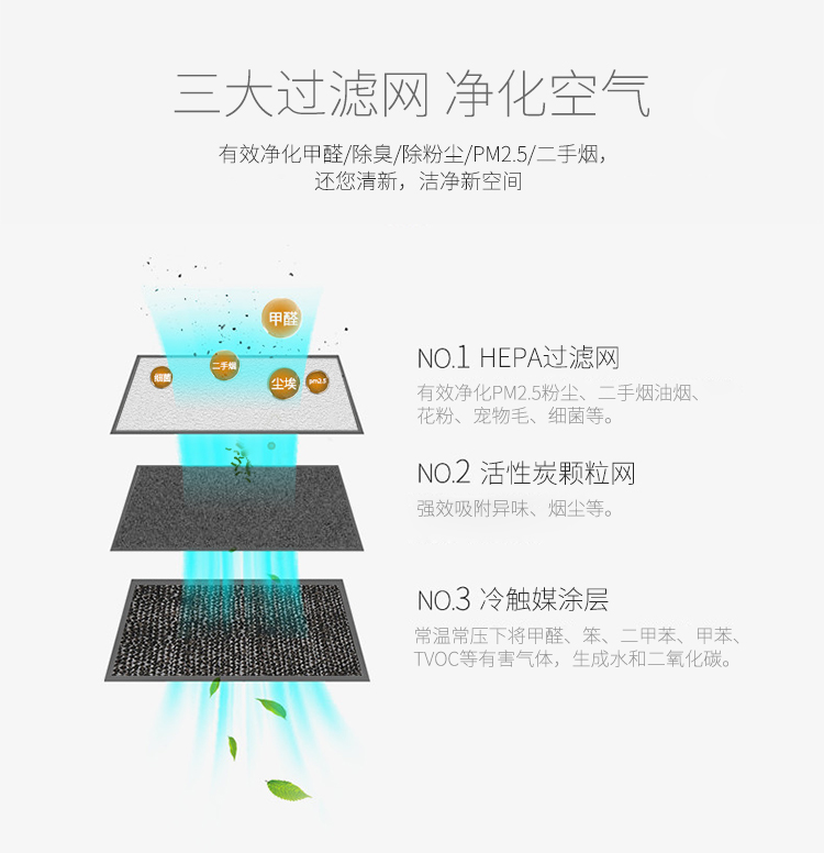 冷觸媒凈化可分解甲醛等有害氣體,HAPA過濾網有效去除PM2.5粉塵;