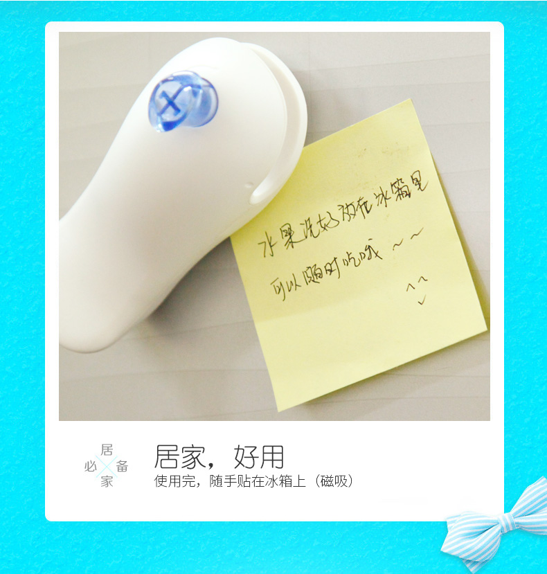 藍色按鈕為功能鍵,轉動按鈕可以切換開口/封口功能,按下按鈕可以實現開/封兩用功能,一機多能,供電方式:2節5號電池。底部有磁鐵,可吸附在冰箱上。