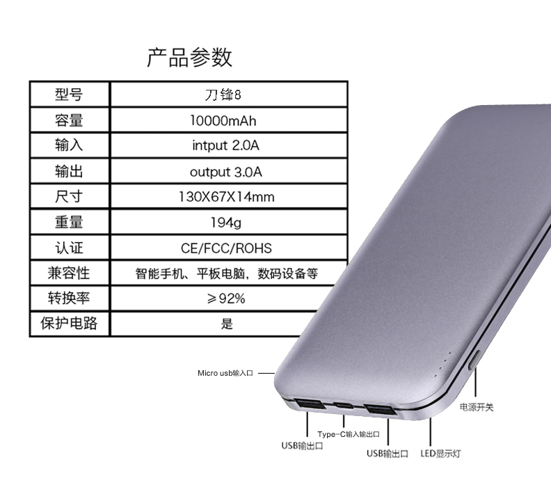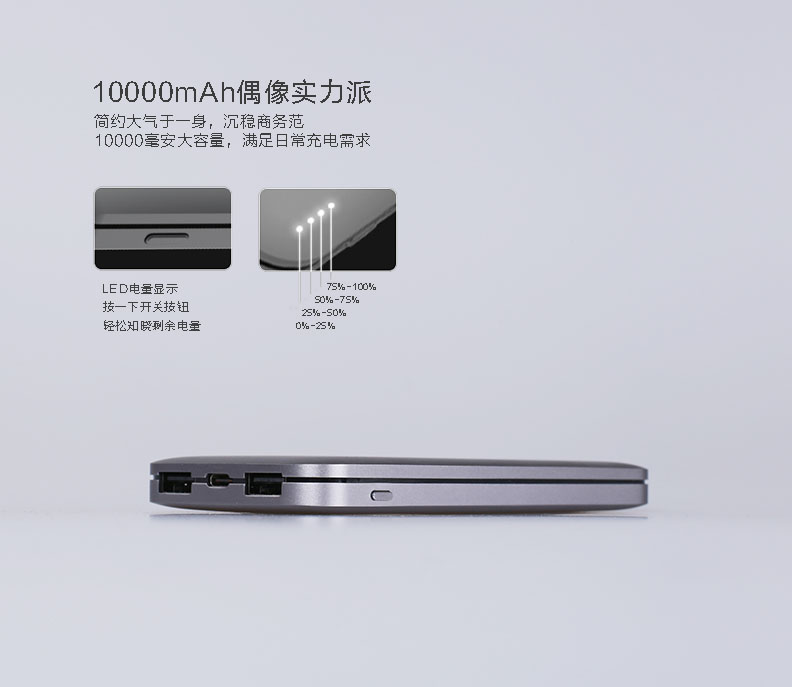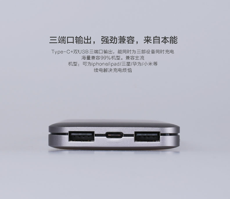 全金屬外觀,10000毫安聚合物電芯,同容量體積縮小30%,重量減少20%;