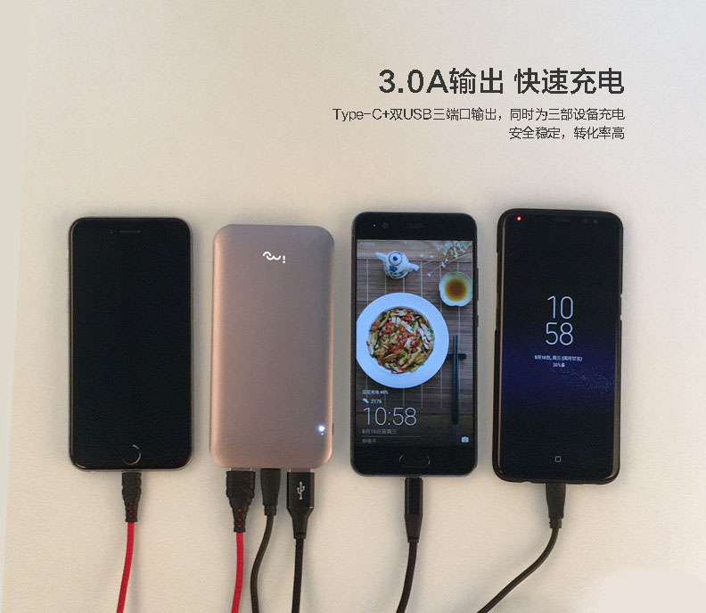 雙USB+TYPE-C三輸出口,同時支持三臺設備充電,最大支持3A輸出;